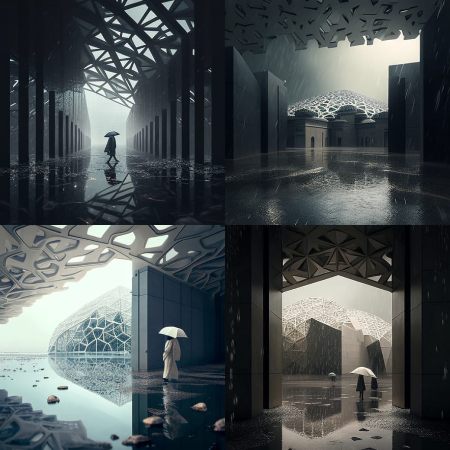 raining in abandon Louvre Abu Dhabi museum 300 years in the future -