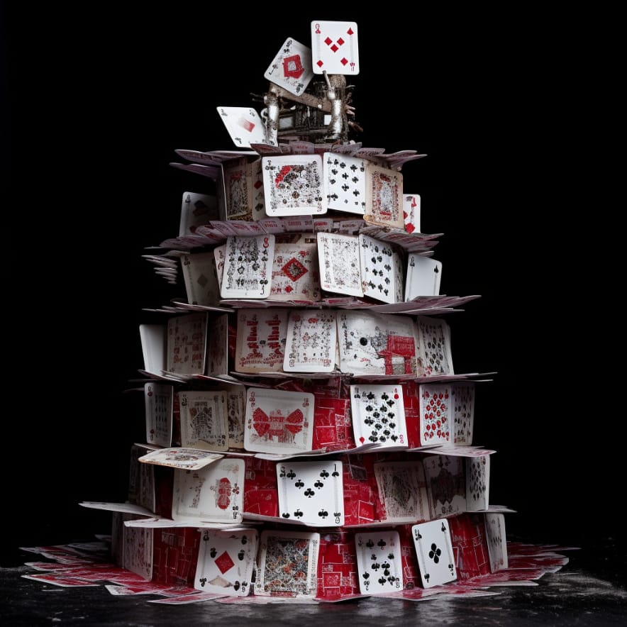 The UniCAKE scam portrayed as a house of cards, just as it's about to come crashing down, with each card symbolizing the misleading price predictions and false promises that built up this fragile structure. The environment is an opulent, but dimly lit casino, filled with the tension of high-stakes gambling and the pervasive air of manipulation. The style is an oil painting, using layered brushstrokes to express the intricate details of the collapsing cards and the ominous atmosphere permeating the casino --c 15